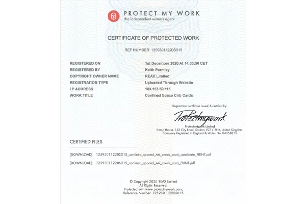 These cards are printed and encapsulated in a hard laminate for increased durability. These packs also come with a pen attached which can be used to write on the cards but is also wipeable so the cards can be reused. Contents Include: What is a Confined Space, Classifications – National Classifications and City & Guilds, Risk Assessment, Access Equipment, Gas Check Procedures, Gas Test Record Sheet, Gas Levels, Ventilation, Breathing Apparatus, Entry Checklist, Emergency Procedures, Accident Reporting, and Leptospirosis. These cards are for reference and guidance purposes only & are NOT a substitute for training. Whilst content is correct at the time of print it may be subject to legislation changes. For up to date regulations please search for the Confined Space Regulations. Copyright © REAX Limited 2021 – Protect My Work – Reference Number: 12593011220S015