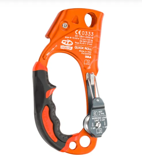 The Quick Roll hand ascender boasted an innovative design from Climbing Technologies with an integrated pulley which allows for greater efficiency when ascending the rope. Used with a self-breaking descender such as a Sparrow.